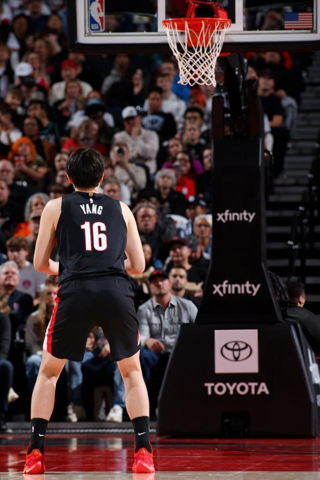 他的第二次出场是在第二节还剩8分钟左右的时候,这一次杨瀚森上来很快尝试一次空切,接到阿夫迪亚传球的他直冲篮下,造成了兰德尔的犯规,站上罚球线。在波特兰主场球迷的欢呼下,杨瀚森两罚两中,拿到了个人NBA生涯的第一分。