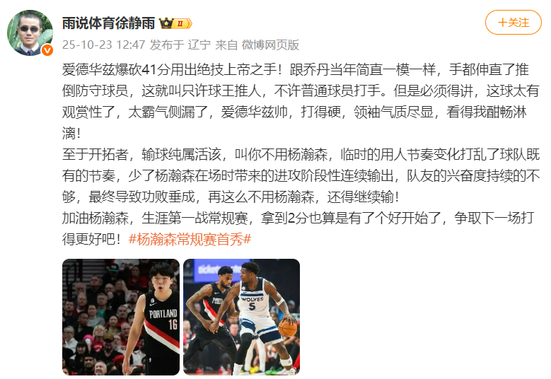 徐静雨表示:加油杨瀚森,生涯第一战常规赛,拿到2分也算是有了个好开始了,争取下一场打得更好吧!