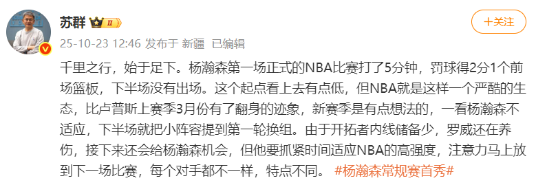 苏群表示:千里之行,始于足下。希望他抓紧时间适应NBA的高强度,注意力马上放到下一场比赛。