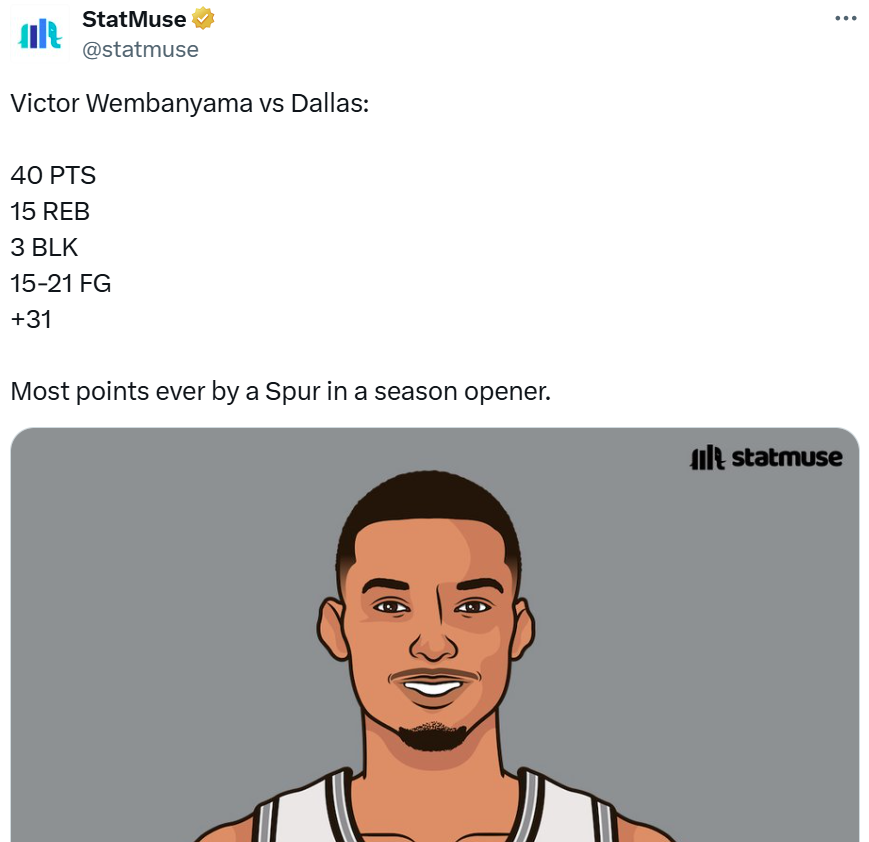 更是成为马刺队史上首位在揭幕战能够拿下40分的球员,超越邓肯、大卫罗宾逊等一众超级巨星。