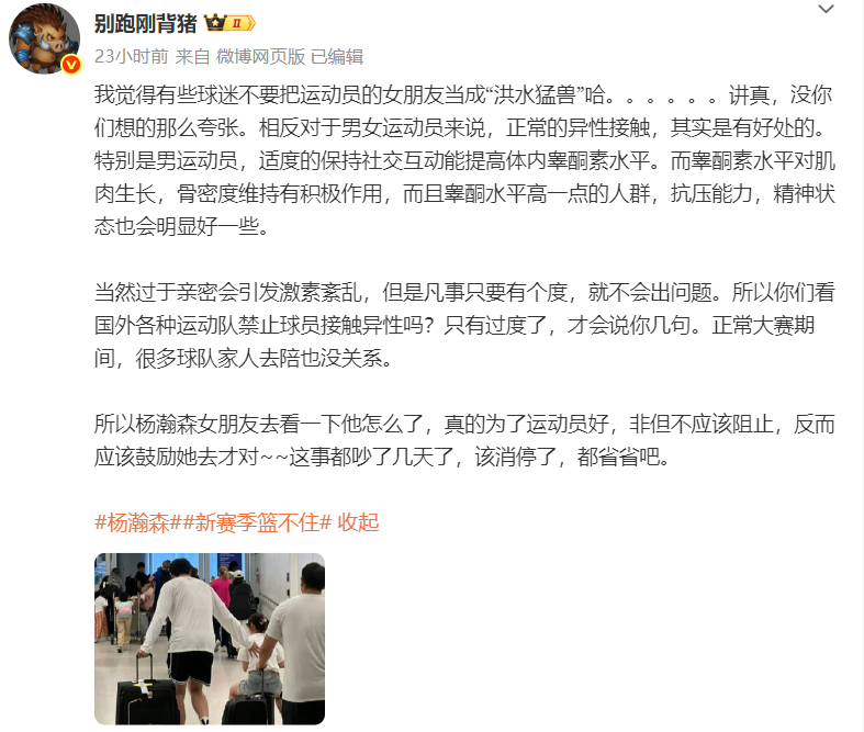 但是广东自媒体人“别跑刚背猪”却并不这么认为,“我觉得有些球迷不要把运动员的女朋友当成‘洪水猛兽’哈。讲真,没你们想的那么夸张。相反对于男女运动员来说,正常的异性接触,其实是有好处的。特别是男运动员,适度的保持社交互动能提高体内睾酮素水平。而睾酮素水平对肌肉生长,骨密度维持有积极作用,而且睾酮水平高一点的人群,抗压能力,精神状态也会明显好一些。”