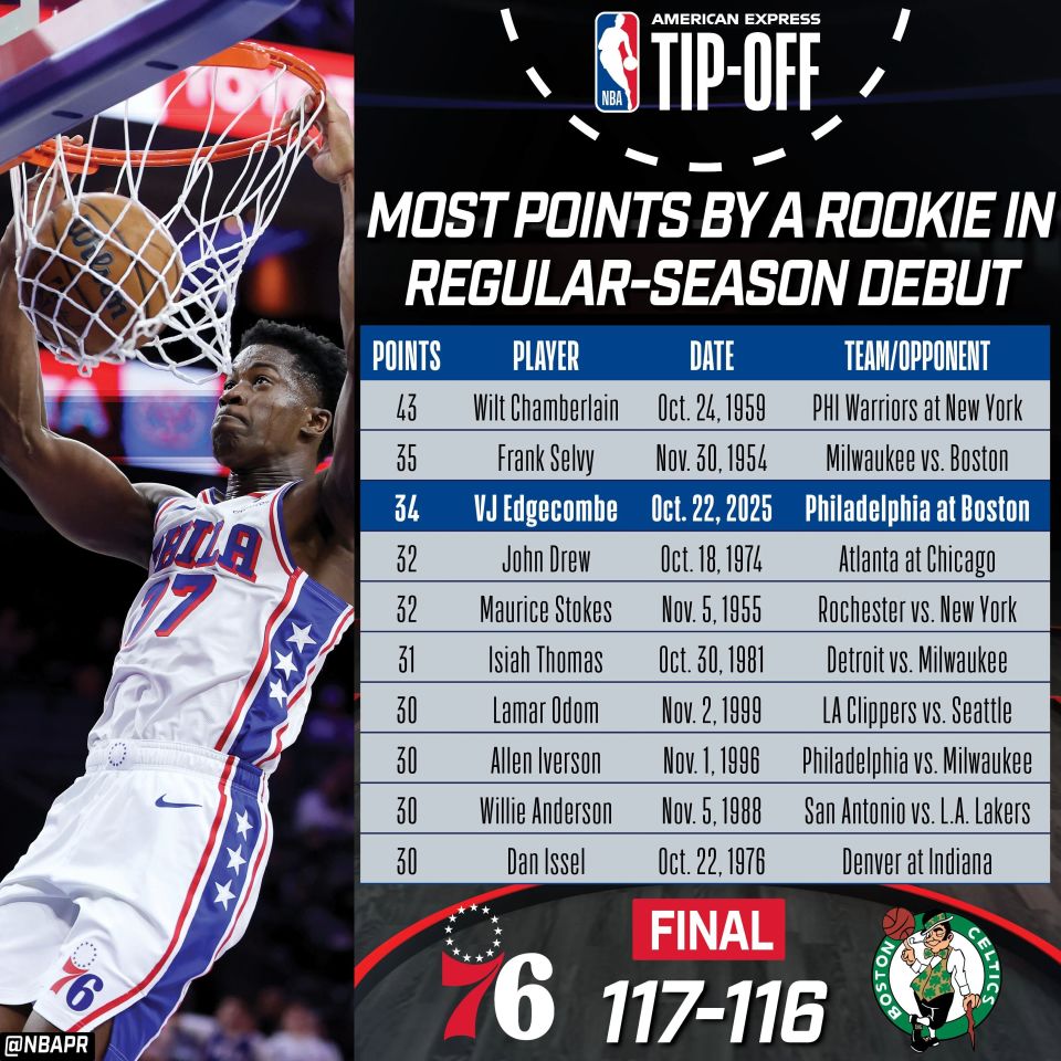 费城117-116险胜凯尔特人马克西41分钟里砍下40分6助,新科探花秀埃奇库姆42分钟里砸出34分7板3助尽显天赋;对面的杰伦布朗,首次单核带队的他,25分6板4助进账。