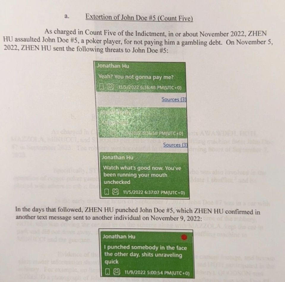 起诉书显示,一位名叫胡震(Zhen Hu,音译)的打手殴打一位扑克牌玩家受害者,逼受害者还债。
