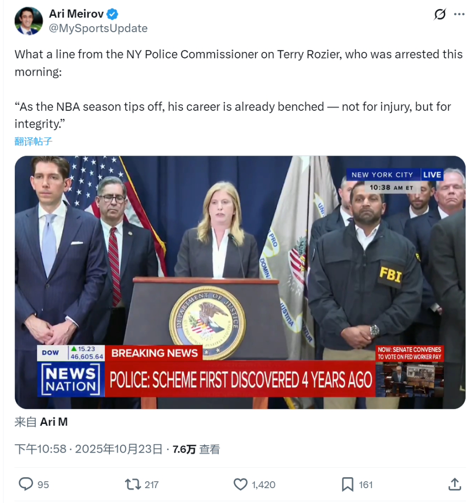 先来说说罗齐尔,他已经被调查很长时间了。从2025年1月开始接受FBI调查,到2025年10月被逮捕,调查持续了9个月。2023年3月23日,黄蜂和鹈鹕的比赛当天上午,一个赌徒针对罗齐尔的下盘,连下30笔赌注且全部命中,获利数百万美元。