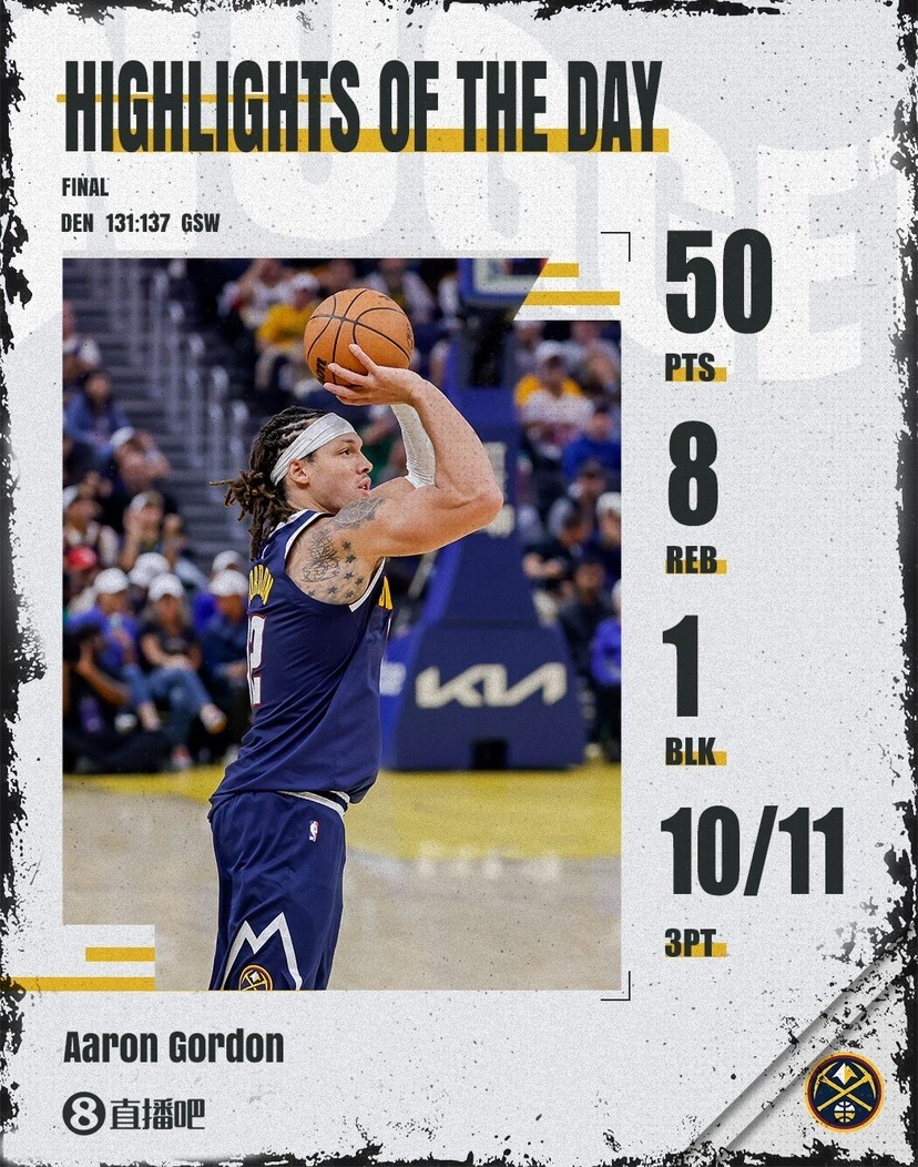 掘金这边,戈登天神下凡,予取予求,投篮21中17、其中三分开挂11中10,轰下生涯新高的50分(此前纪录41分),外加8板2助。