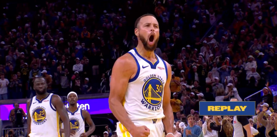 追梦接球后,库里从后场向前跑动,接追梦传球后,抓住穆雷和约老师换防的片刻时间,果断超远三分出手,完成命中。勇士起死回生,将比赛拖入加时。