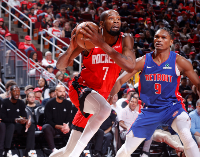 火箭迎来主场揭幕战,姚明等火箭名宿都到场观战,比赛开打后杜兰特开场打成强硬2+1以及命中火箭生涯第一记三分球,可打着打着火箭进攻断电,被活塞一波攻势领先到9分,之后杜兰特2+1点燃进攻,火箭疯狂反扑,申京压哨得分,首节打完火箭33-32领先1分。