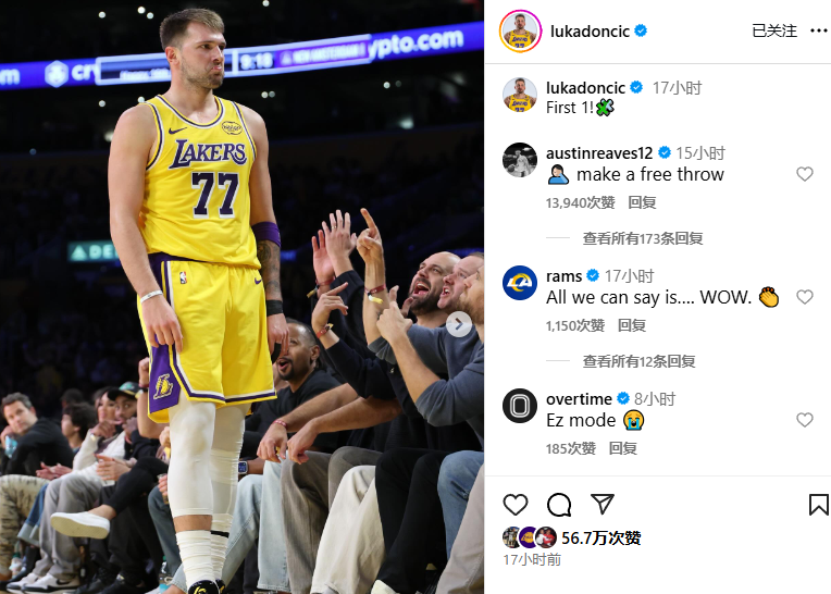东契奇在社媒上晒出多张帅照庆祝取得赛季首胜,湖人官方、詹姆斯、布朗尼、里夫斯、布伦森都为东契奇点赞;里夫斯更是在评论区调侃:把球罚进;对于里夫斯的调侃,东契奇回复道:给我闭嘴。