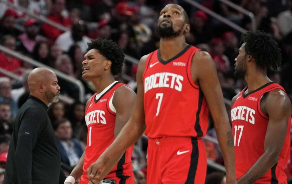 前两场比赛,其实火箭大部分球员表现都不错;包括杜兰特,前两场场均得到30分6篮板,命中率53%,申京揭幕战也打出39分11篮板7助攻的炸裂数据。