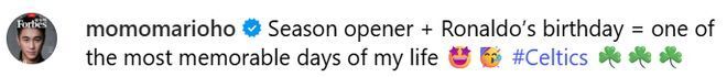 在晒出了妻子和儿子的照片时,何猷君写道:“赛季首秀+罗纳尔多的生日=我生命中最难忘的一天之 #凯尔特人”。