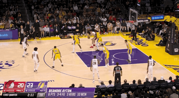 半场比赛结束,开拓者57-51领先湖人。上半场比赛开拓者2人上双,阿夫迪亚17分4篮板,格兰特14分,湖人这边2人上双,里夫斯23分5助攻,艾顿10分5篮板。