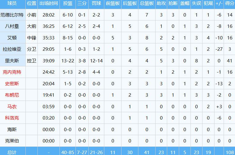 湖人那边,艾顿面对旧主16分8板(5前场板)2助2断,里夫斯41分4板5助3断。