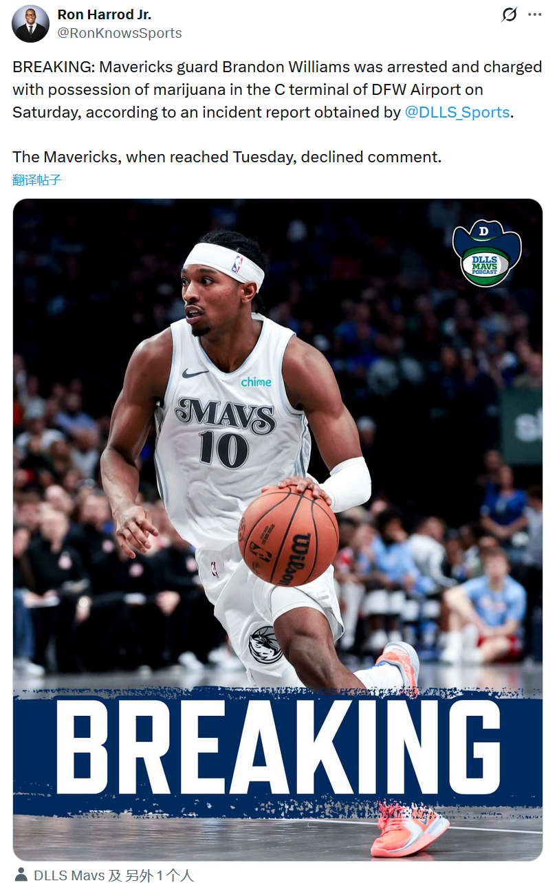 根据DLLS Sports 记者 Ron Harrod Jr. 报道,独行侠队后卫布兰登-威廉姆斯于 2025 年 10 月 25 日(周六)在达拉斯 - 沃斯堡机场 C 航站楼因持有大麻被捕并遭起诉。