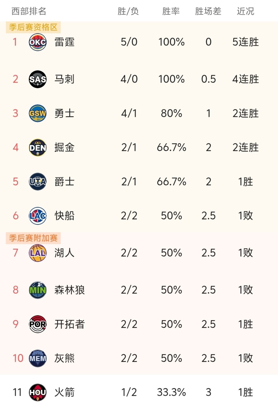 随着雷霆107-101五连胜,勇士赢球,西部最新排名出炉:火箭第11!