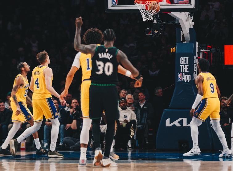 在华子无法出战的情况下,兰德尔成为了森林狼场上的绝对核心,此役面对艾顿和八村塁的湖人内线双塔,兰德尔打出了不错的个人进攻效率,不仅篮下强攻能够得分,还命中了4记三分球,贡献了33分、5个篮板、6次助攻和1次抢断的个人数据。