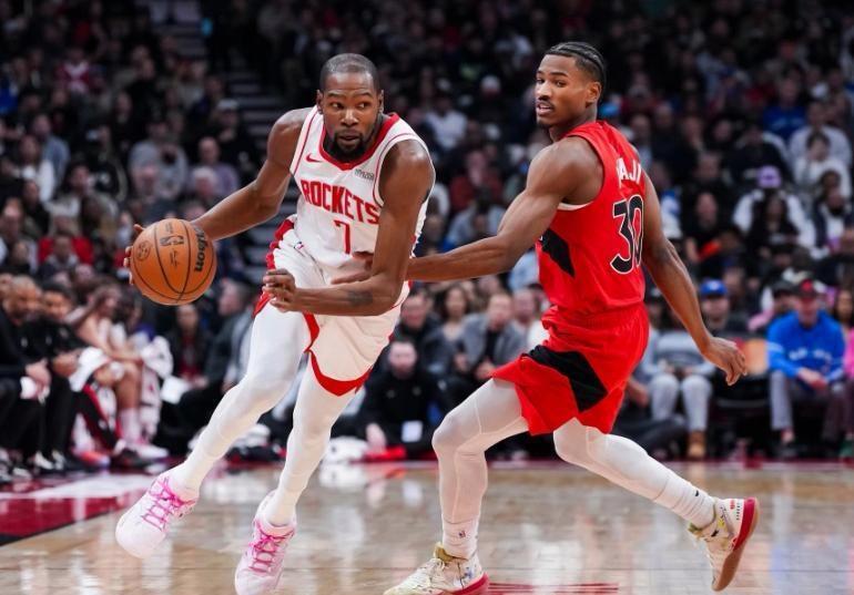 下半场比赛开始,易边再战,巴恩斯背转身勾射扎实命中,揭开第三节比赛序幕,小史密斯篮下高举高打,快速出手擦板也有,杜兰特横冲直撞到禁区内制造犯规,站上罚球线两罚都有,奥科吉追身夺命三分箭长虹贯日,直追篮心,小史密斯手感火热,调整姿势后的三分开火继续命中,英格拉姆钟摆变向,急刹车跳投出手两分落袋。火箭这个进攻火力太猛了,全员都能突能投,三节比赛打完,他们继续扩大领先优势,101-89领先猛龙12分。末节决战,杜兰特加强进攻侵略性,单节独得12分带队终结比赛,最终,火箭139-121大胜猛龙,取得两连胜。