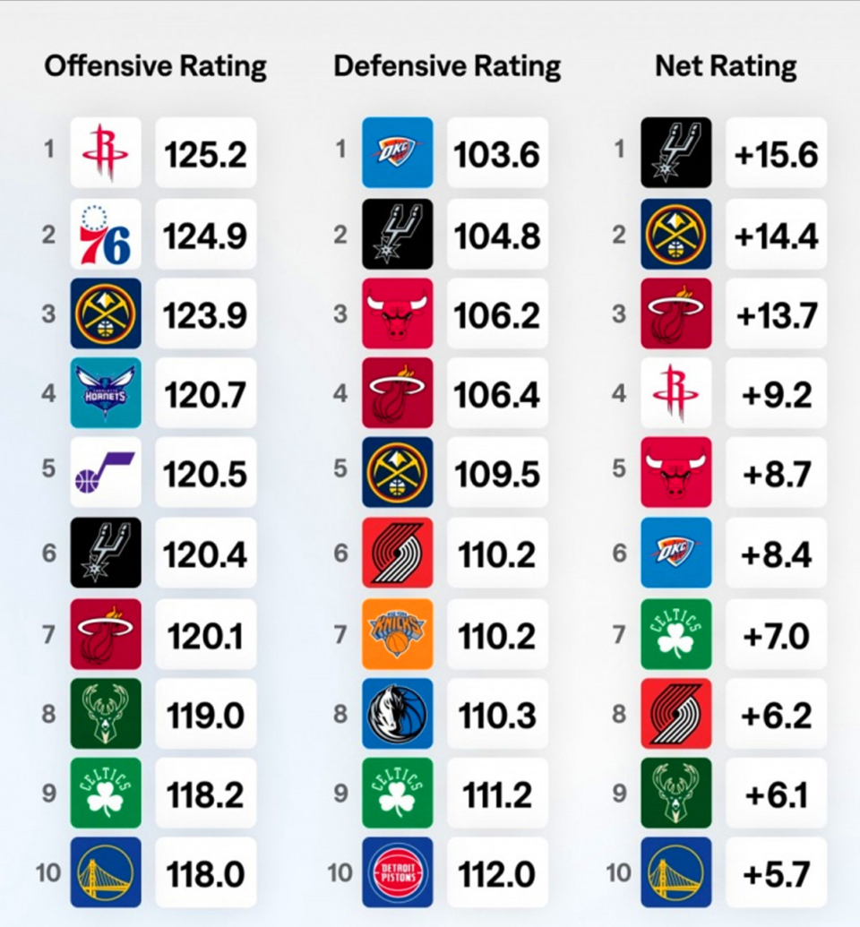 根据美媒《Kalshi Sports》统计,开赛至今火箭队125.2的进攻效率(百回合得分,越高越好)力压76人队高居联盟第一,同时+9.2的净效率值(百回合净胜分,越高越好)位列联盟第四。