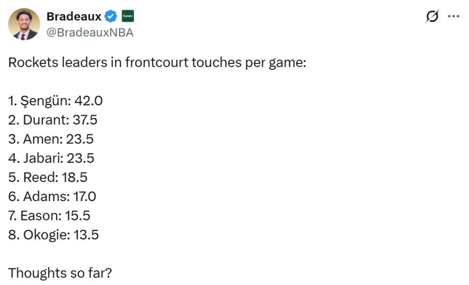 开赛至今,小贾场均触球23.5次,相较上个赛季大幅提升,成功追平阿门并列火箭队第三,仅次于杜兰特37.5次和申京42次。