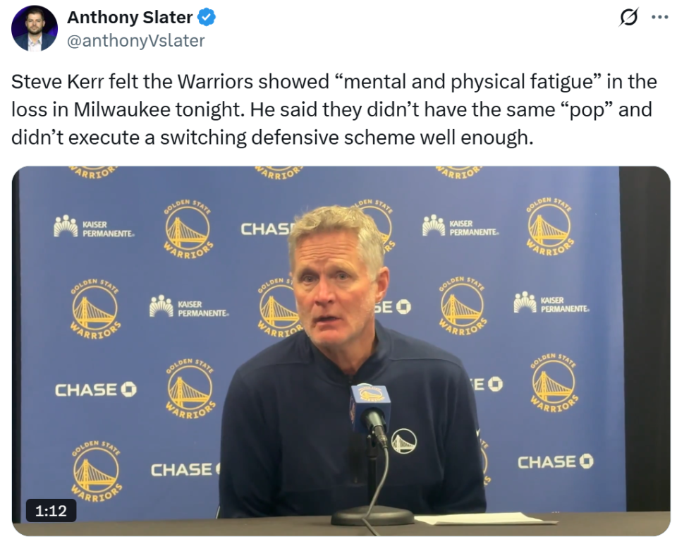 字母哥因伤缺席,开季至今高歌猛进的勇士队在库里与巴特勒双核拿下50分的情况下为何爆冷输给残阵雄鹿?主帅科尔赛后通过讽刺全队的方式给出3大败因。