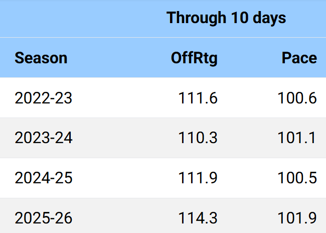 北京时间11月1日,2025-26赛季仍处于开局阶段,目前有4支球队保持不败,3支球队尚未取得首胜。尽管局势可能快速变化,但以下10组数据仍能清晰展现赛季前10天的关键趋势。所有数据统计截至北京时间10月31日。