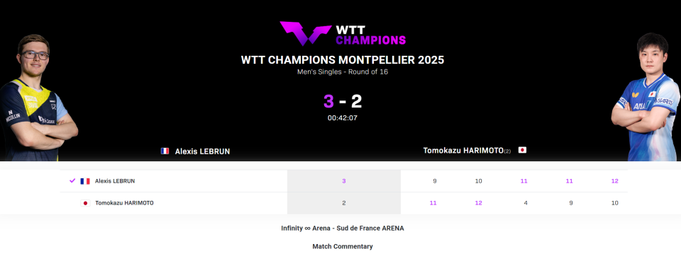 WTT蒙彼利埃冠军赛男单1/8决赛,法国选手艾利克斯-勒布伦3-2逆转日本选手张本智和晋级,五局比分:【9-11,10-12,11-4,11-9,12-10】。换言之张本智和在大比分2-0领先的情况下连丢三局,这得多么难受啊?