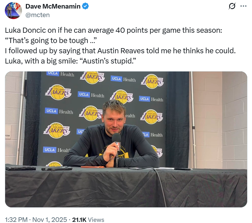 面对这一有趣话题,赛后东契奇也给出回应,东契奇笑着说道场均40分很难达到,但对手越是包夹我,我就越是想要去拿下分数。