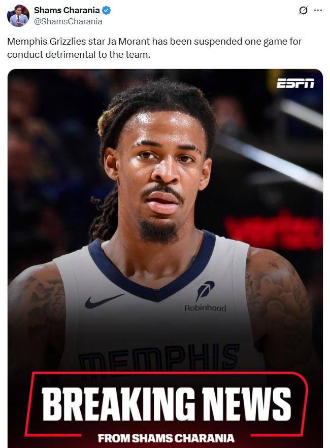 根据ESPN名记Shams报道,灰熊队因莫兰特做出有损球队利益的行为,被禁赛一场,预计将因此损失27万2042美元。