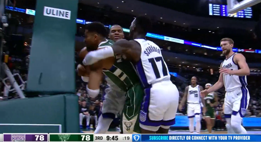 下半场,威少搭配德罗赞、施罗德、拉文和小萨首发出战,第三节国王38-31反超比分,威少在场上打得充满能量,冲抢篮板以及助攻队友,单节7次助攻串联全队;期间威少凶狠犯规引热议,当时字母哥快攻反击,威少暴力拉抱才拦住字母哥,裁判多角度回放这一幕,最终未升级判罚。