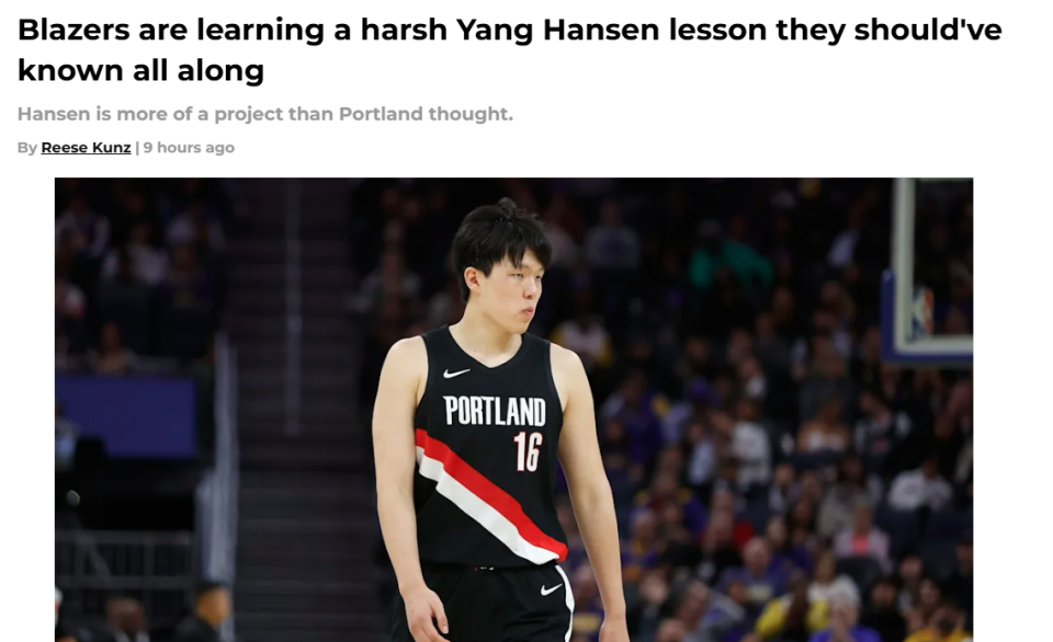 开拓者队记Reese Kunz也撰写长文分析杨瀚森的艰难成长处境,呼吁球迷对他保持更多的耐心,直言开拓者队虽然最初未将其视作一个长期培养的潜力股,但愿意花费几年时间让其慢慢成长。