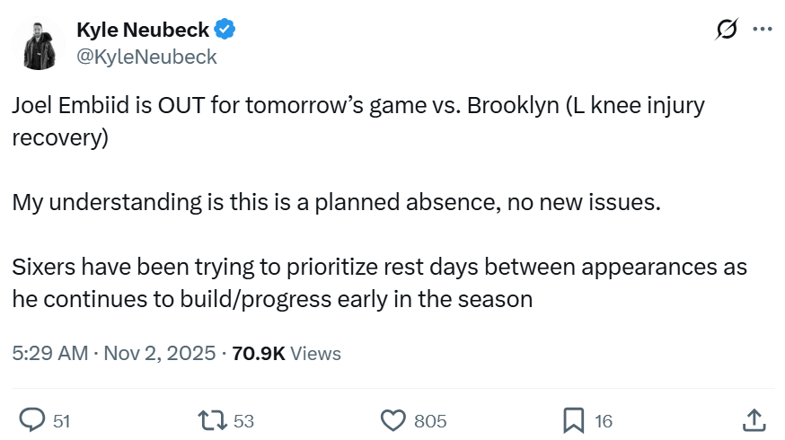 本场比赛开始前,76人队记Kyle Neubeck曝出恩比德因为左膝伤病管理缺席本场比赛,同时专门强调恩比德伤病没有出现新的状况,本场缺席本就在计划之中。
