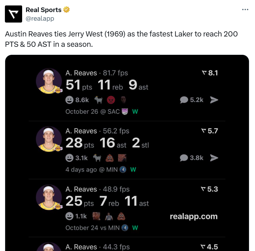 这也是里夫斯开季至今火热表现的缩影,开季仅花费7场比赛,里夫斯已经拿到超过200分50次助攻,成功追平杰里-韦斯特(1969年)并列湖人队史第一。