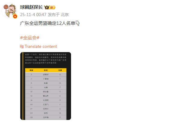 媒体人赵探长透露广东全运会男篮的12人名单已经确定,由赵睿、胡明轩领衔,12名球员都有国手或进入国家队集训的经历。