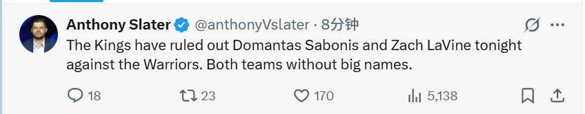 北京时间11月6日,国王主场对阵勇士。国王后卫拉文(背部伤势)与前锋小萨博尼斯(肋骨伤势)均将缺席今晚的比赛。勇士一方的库里已经提前确定无缘本场比赛,这是背靠背的第二场,而且他的感冒加重了。巴特勒因腰部拉伤、追梦因肋骨挫伤也将缺阵。