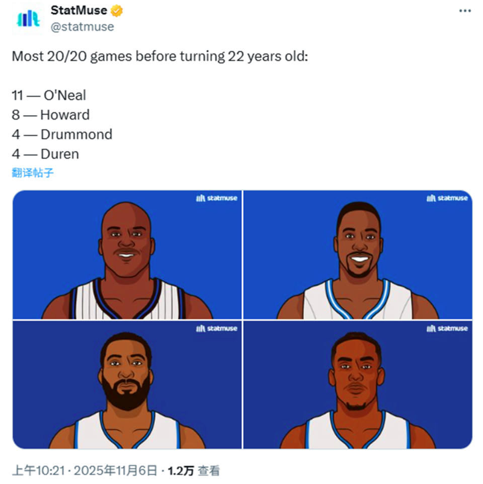 杰伦杜伦在22岁前已经第4次单场交出20+20表现,追平活塞昔日建队核心庄神并列历史第三,前二分别是魔兽霍华德8次和大鲨鱼奥尼尔11次。