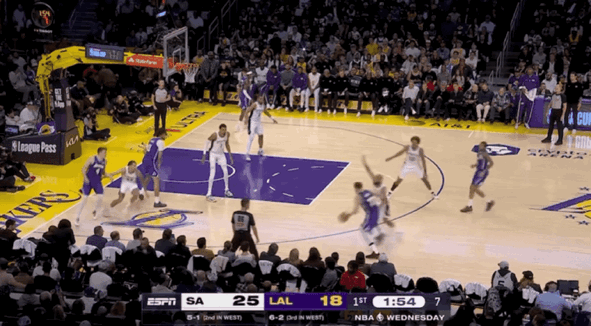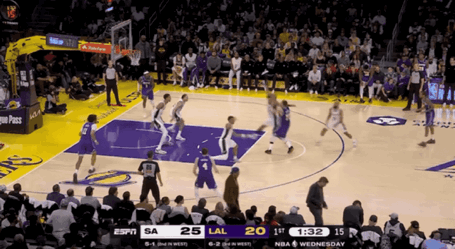 两队持续缠斗,湖人在马刺身上赔上了太多犯规,马刺打出进攻压制再次重夺双位数领先优势。东契奇又一次为湖人挺身而出,他与海耶斯完成空接暴扣配合为球队止损。但是湖人仍然没能解决犯规危机,马刺在本节获得了16次罚球,在巨大的罚球差距下成功带着8分领先进入第四节。