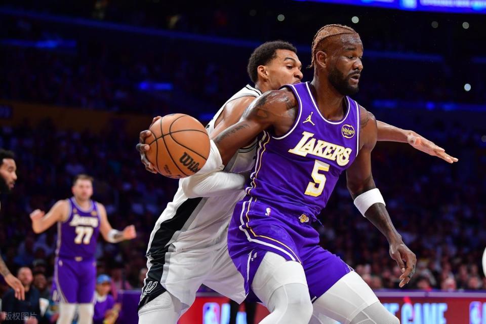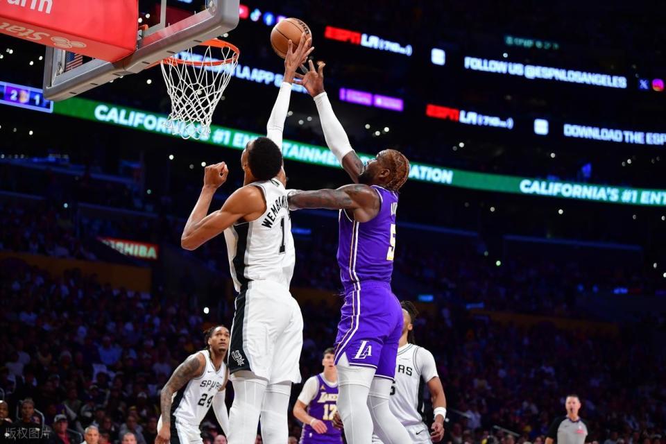 末节初段,拉拉维亚中投先进,文班被斯玛特造第5犯被换下,沃特斯三分命中,东契奇助攻给海斯空接2+1!此后双方比分交替上升,艾顿篮下抛投打进追到97-103,马刺喊停。暂停以后,索汉命中三分,东契奇造犯规罚球,艾顿大帽以后,东契奇反击给到八村三分再中,湖人追到只差2分。马刺又一个暂停,然后双方争夺白热化,斯玛特前场篮板拿下来打进追平,文班亚马立马还以颜色。东契奇大心脏三分反超,文班亚马6犯毕业,马刺挑战失败。艾顿两罚两中以后,湖人挑战出界成功,八村罚球领先到了4分,马刺抢攻以后犯规战术,但连续三分不进。斯玛特最后时刻发球踩线失误,给马刺0.4秒。尚帕尼空接被犯规,但两罚不中,凯尔登压哨补篮也没有,遗憾输球。