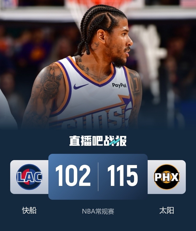 易边再战,快船突然哑火,太阳攻防两端压制对手,布克和杰伦-格林联手带队轰出28-8的进攻狂潮一举确立20分的领先优势,快船连造杀伤苦苦支撑,末节太阳延续火力,又是11-3的攻击波再度将分差拉开到20分以上,泰伦-卢换下主力投子认负。最终,太阳115-102击败快船,主场过关。