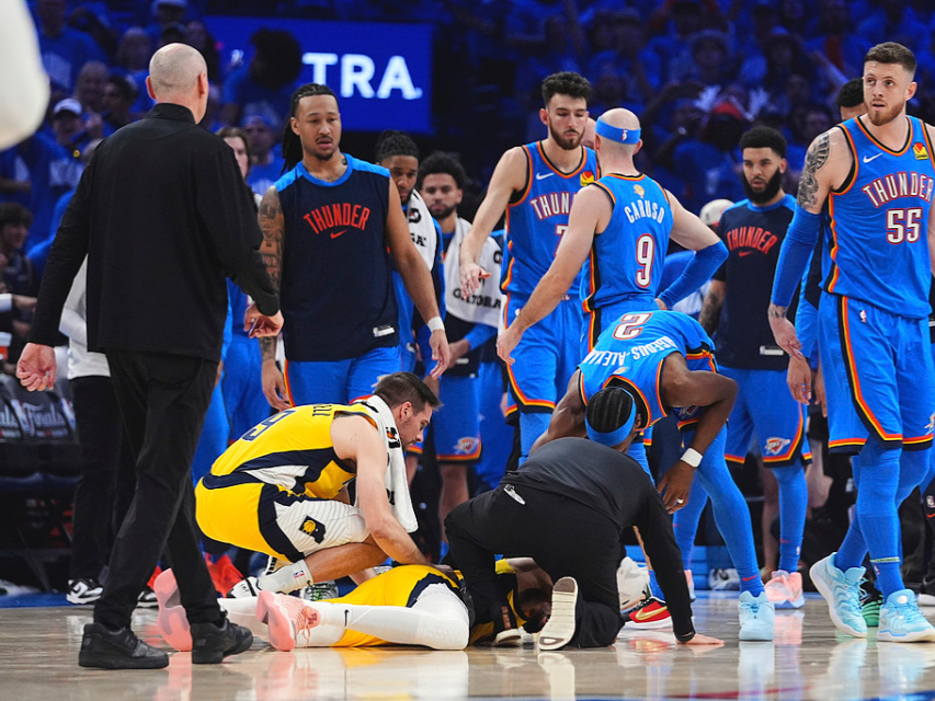 系列赛前六场,双方打得难分难解,比赛被拖入抢七决战。然而G5开始,隐患已经显现——哈利伯顿因右小腿伤势状态大幅下滑。