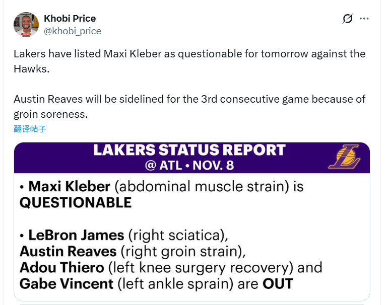 北京时间11月8日,湖人官方更新明日对阵老鹰的伤病报告,里夫斯连续第三场比赛缺阵,伤情从腹股沟酸痛变成拉伤!同样缺席这场比赛的还有詹姆斯、蒂耶罗和文森特。克勒贝尔的状态是出战成疑。