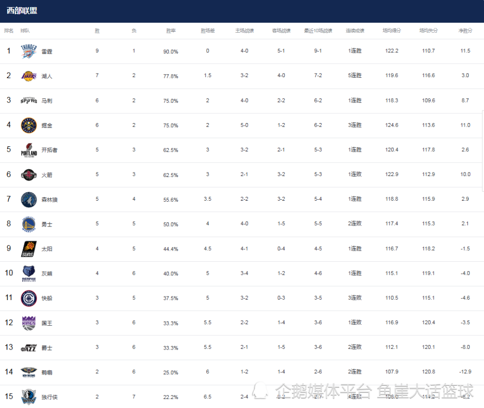勇士在今天的比赛中对阵掘金,这场比赛勇士是缺少了库里,所以本场比赛哪怕格林的外线三分一度爆发,但是在硬实力上勇士跟掘金差距依旧巨大,因此随着比赛的进行掘金还是拉开比分,面对这样的情况下勇士真的是没有太多反抗之力,毕竟约基奇、穆雷和戈登就让勇士苦不堪言,更不要说布劳恩等人也在比赛中有着不错的发挥,最终掘金大胜勇士。在这场比赛后掘金3连胜排在西部第四的位置,勇士2连败排在西部第八的位置,而且勇士西部第八的位置也不稳,毕竟西部第九的太阳仅仅落后勇士0.5个胜场,所以勇士还不能够止住颓势的话,那么勇士在西部的排名有可能继续下降。雷霆在今天的比赛中对阵国王,其实在上半场比赛里国王还一度跟雷霆打得难解难分,但从第二节比赛后半段雷霆就开始拉开比分,到了下半场比赛雷霆更是逐渐打没比赛悬念,而面对这样的情况国王也真的没有太多办法,毕竟威少已经是在比赛中做到了自己该做的事情,可惜国王还是无奈输球。这场比赛后国王排在西部第十二的位置,雷霆以9胜1负的战绩排在西部第一的位置,而且现在卫冕冠军雷霆也是稳压湖人,毕竟现在的雷霆还领先湖人1.5个胜场,同时根据现在的消息里夫斯也从原来的腹股沟酸痛变成腹股沟拉伤,因此湖人的伤病恐怕会影响他们的战绩,届时湖人想要追上雷霆会有着更大的难度。