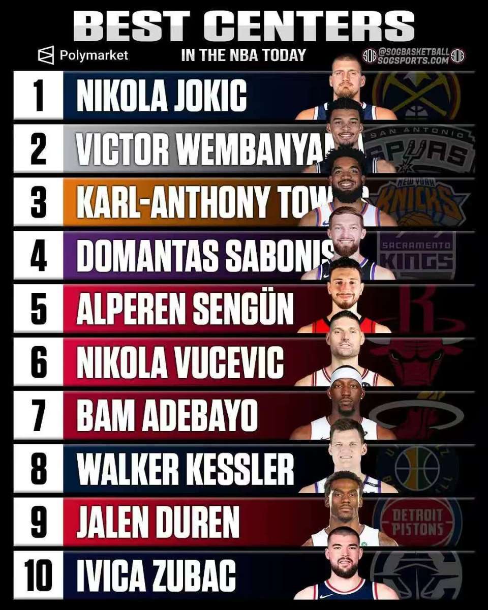 中锋前十依次是:1约基奇、2文班、3唐斯、4萨博尼斯、5申京、6武切维奇、7阿德巴约、8凯斯勒、9杜伦、10祖巴茨。约基奇作为现役联盟第一人,他排在这个位置是没有任何问题的,本赛季仍旧是场均三双,太厉害了。文班在本赛季涨球了,此前一度杀到了MVP榜第一,顶级的防守+进攻端的进步,才三年级已经很强了。