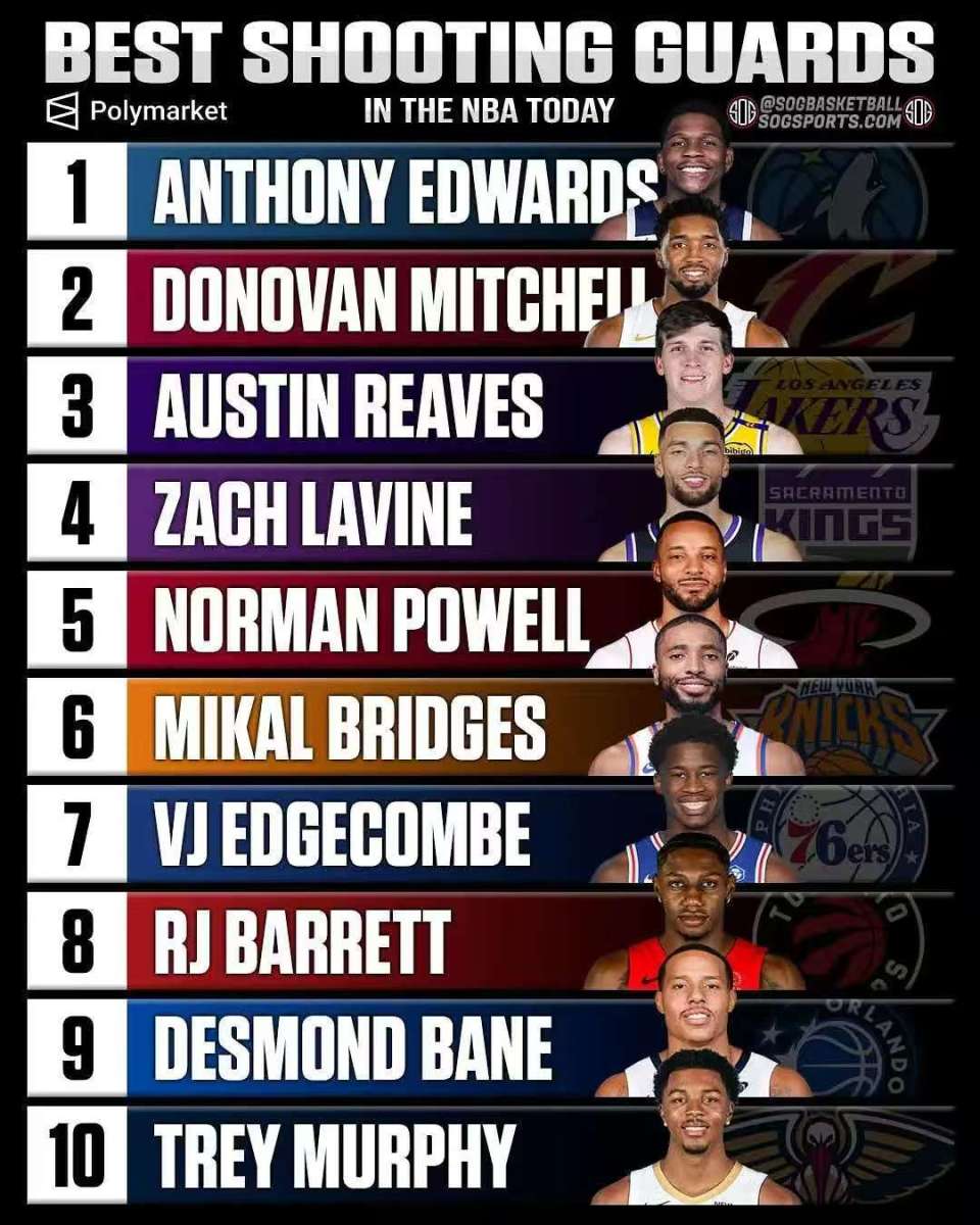 分卫位置上前十依次是:1爱德华兹、2米切尔、3小里、4拉文、5鲍威尔、6布里奇斯、7埃奇库姆、8巴雷特、9贝恩、10特雷墨菲。爱德华兹依旧是现役联盟第一分卫,这个不会质疑的,本赛季的华子,他的中距离有了提升,进攻武器库又强化了。米切尔是现役联盟得分爆发力最强的球员之一。