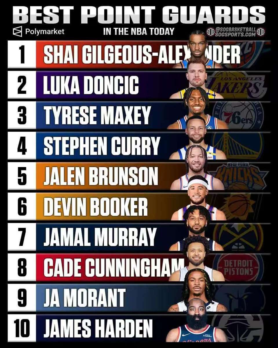 马克西依靠着本赛季狂暴的表现,他升到了第三位,马克西是费城的下一个AI,库里虽然到了生涯末期,但论投射能力,他依旧是联盟最强,布伦森本来是东部第一控卫,结果因为马克西的崛起,他跌到了第五的位置,贾马尔默里本赛季发挥也不错,因此升到了第七,坎宁安我觉得排名低了,莫兰特能排在哈登前面?虽然哈登老了,但带队能力比莫兰特要强。