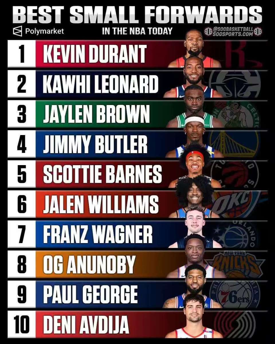小前锋前十依次是:1杜兰特、2伦纳德、3布朗、4巴特勒、5巴恩斯、6杰威、7弗拉格、8阿奴诺比、9乔治、10阿夫迪亚。杜兰特在加盟火箭之后,他证明了自己依旧是联盟最好的得分手之一,他给火箭最大的提升,我觉得是他吸引防守,给队友创造了轻松得分的机会。伦纳德本赛季还是非常稳定,但也不在巅峰了,近期又伤了。