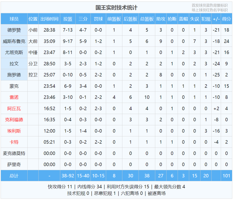 下半场雷霆对威少针对性防守,一突破就有2-3人包夹,切断他的传球路线,导致威少失误增多。威少本场正负值-18,已经是国王首发当中最高的。NBA杯除了决赛,其余也算常规赛战绩。雷霆9胜1负领跑联盟,国王3胜6负西部第12。