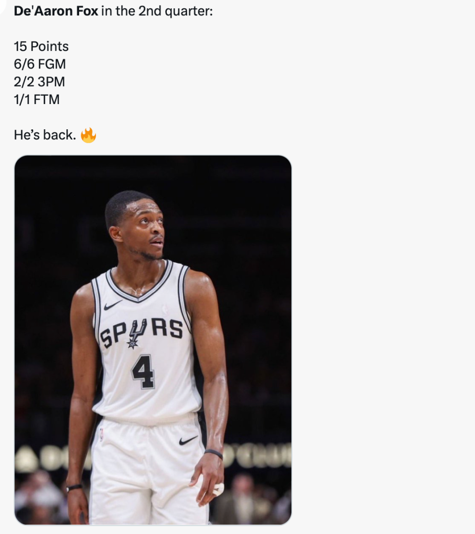 是的呢,今天福克斯终于复出,迎来赛季首秀。