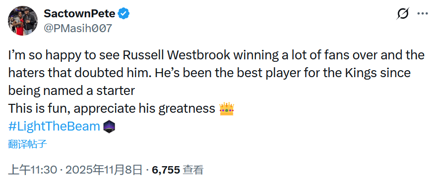 与此同时,多人表达了对于威少的惋惜,因为眼下国王队并没有太多竞争力。国王分析师Sactown Pete在社交媒体上表示:“我真的非常高兴看到威少得到这么多球迷的喜爱,并让那些曾经质疑他的人对他刮目相看。自从上了首发之后,他就是国王最出色的球员。这真的很令人兴奋,让我们欣赏他的伟大吧。”