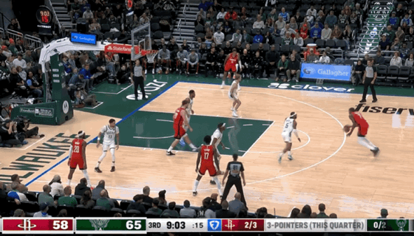 末节比赛,谢泼德利用精准投射帮助火箭持续追分,但雄鹿总有进攻回应,字母哥连续强势暴扣始终为雄鹿掌握微弱领先。杜兰特在本节还剩下8分06秒回归,雄鹿坚决不给他轻易出手的机会,尽可能包夹杜兰特让他分球。
