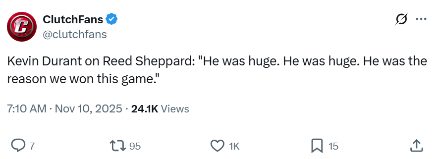 除了夸赞申京之外,乌度卡赛后也点名夸赞了谢泼德的防守表现,坦言后者变得越来越自信,攻防两端都存在感十足,拥有一双可以不停送出抢断的手,所以他已经是一名必须进入轮转的球员,哪怕对手会试图针对他,但球队会找到空档让其进入阵容中。