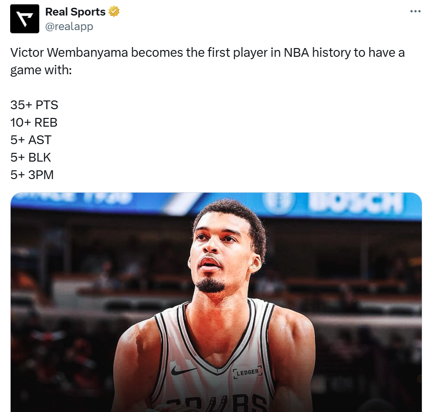 同时成为NBA历史上首位在单场能够拿到至少35分10篮板5助攻5盖帽,且能命中至少5记三分的球员。